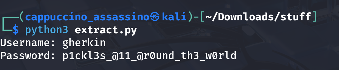 Password: p1ckl3s_@11_@r0und_th3_w0rld