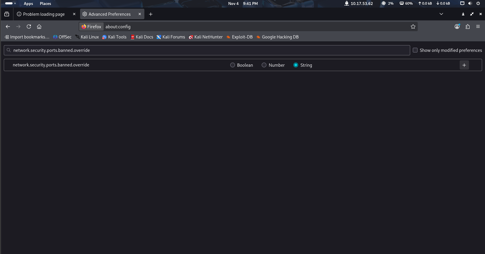Firefox configuration file about:config in Firefox From here, search for network.security.ports.banned.override. In some versions of Firefox this might show nothing (in which case right-click anywhere on the page, choose new -> String and use the search query as the preference name) — in others it will show the same as for me:
