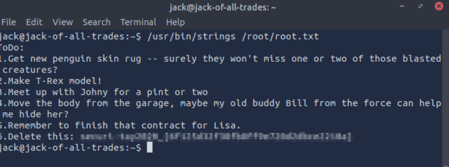 In this room you’ll find artifacts or notes pointing to a root credential or a file containing useful hints. For example you may find a ToDo: or a strings /root/root.txt output with root-flag-like content.