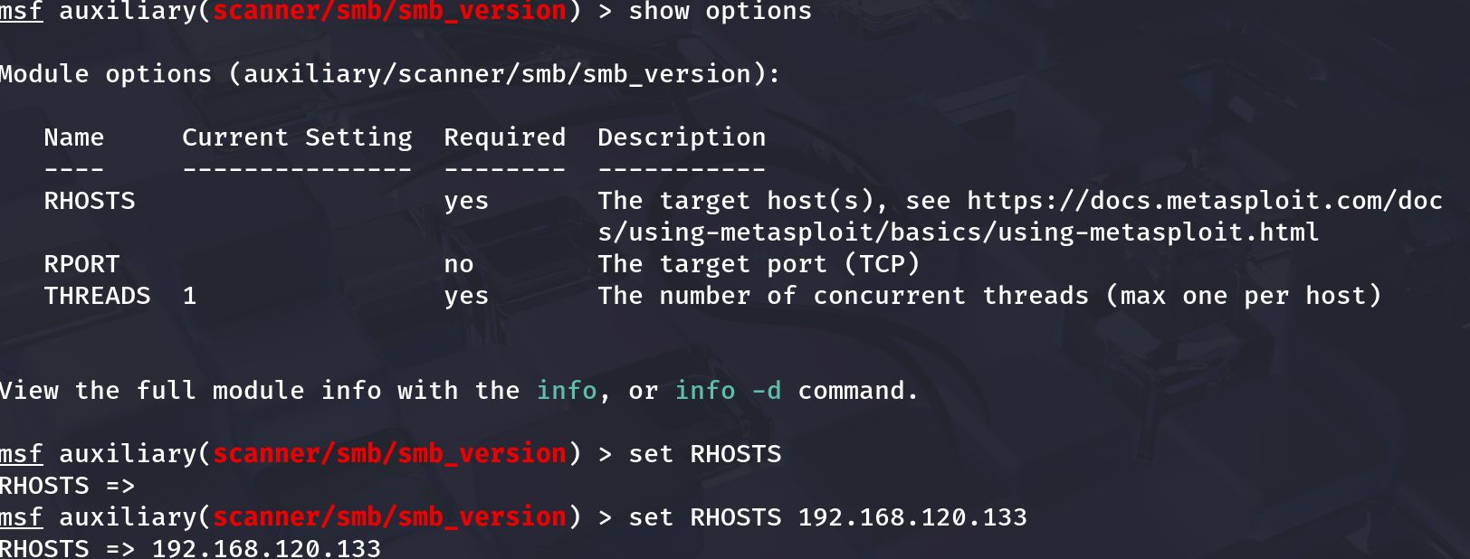 msf auxiliary(smb_version) > set RHOSTS 192.168.120.133