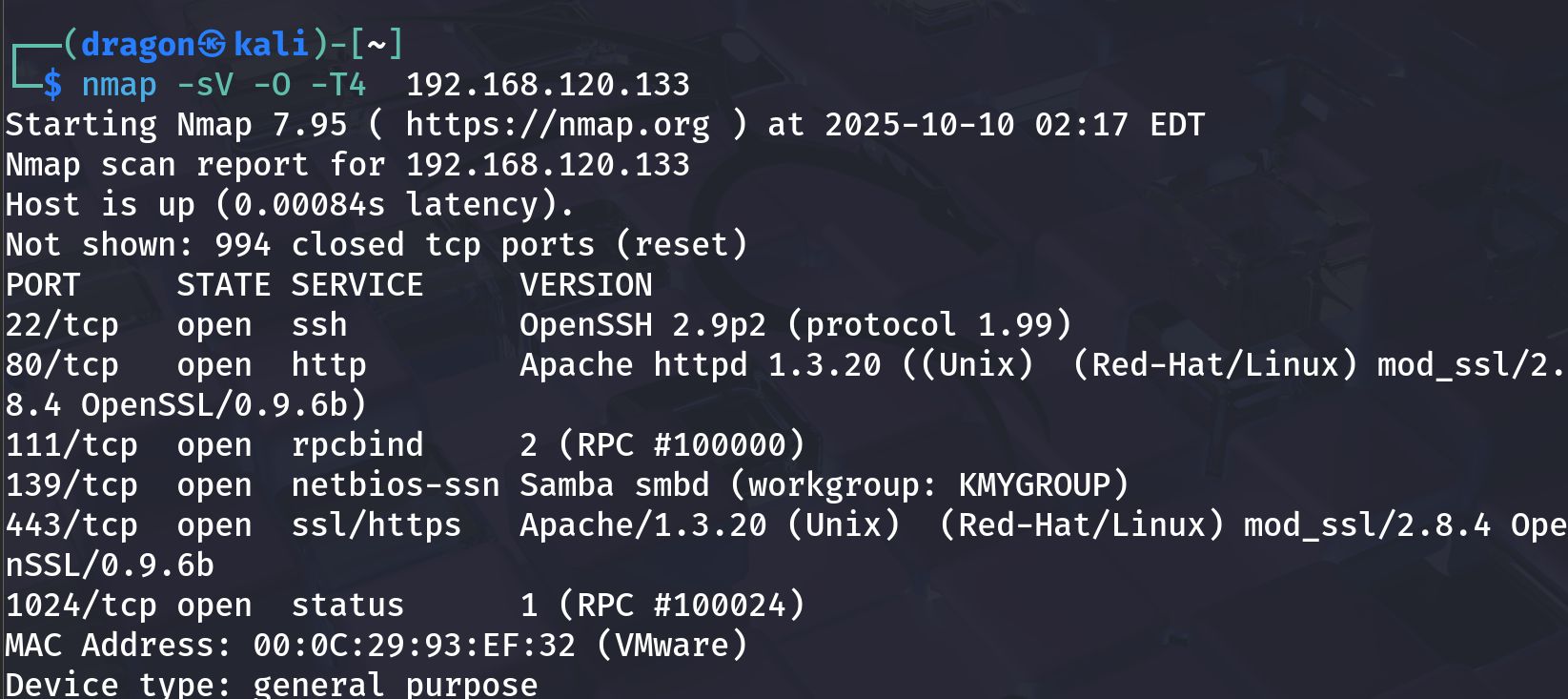 nmap -sV -O -T4 192.168.120.133 -oN scans/kioptrix_nmap.txt